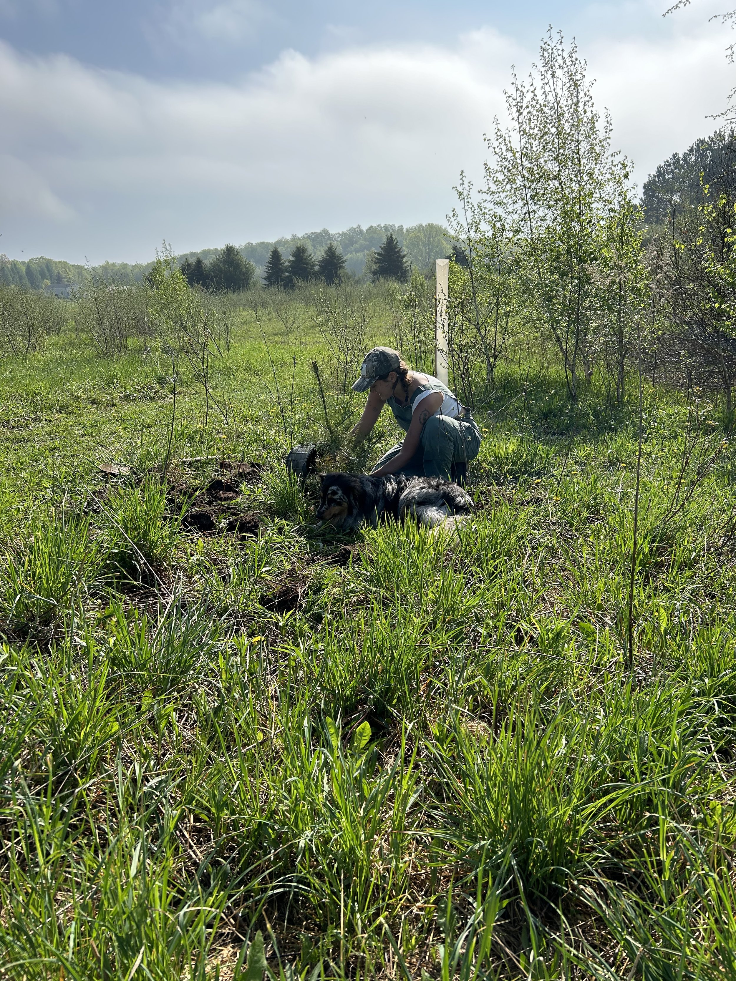 Our whole project at the farm started with a desire to return trees to the once densely forested fields that make up most of our 16 acres. Each year, we plant and care for hundreds of native trees, shrubs, and perennials. While we generally do not engage in land management, we employ practices that improve biodiversity and ecosystem resilience. These include controlled burns, targeted grazing, protecting and caring for native trees and bushes, and establishing native pollinator habitat.